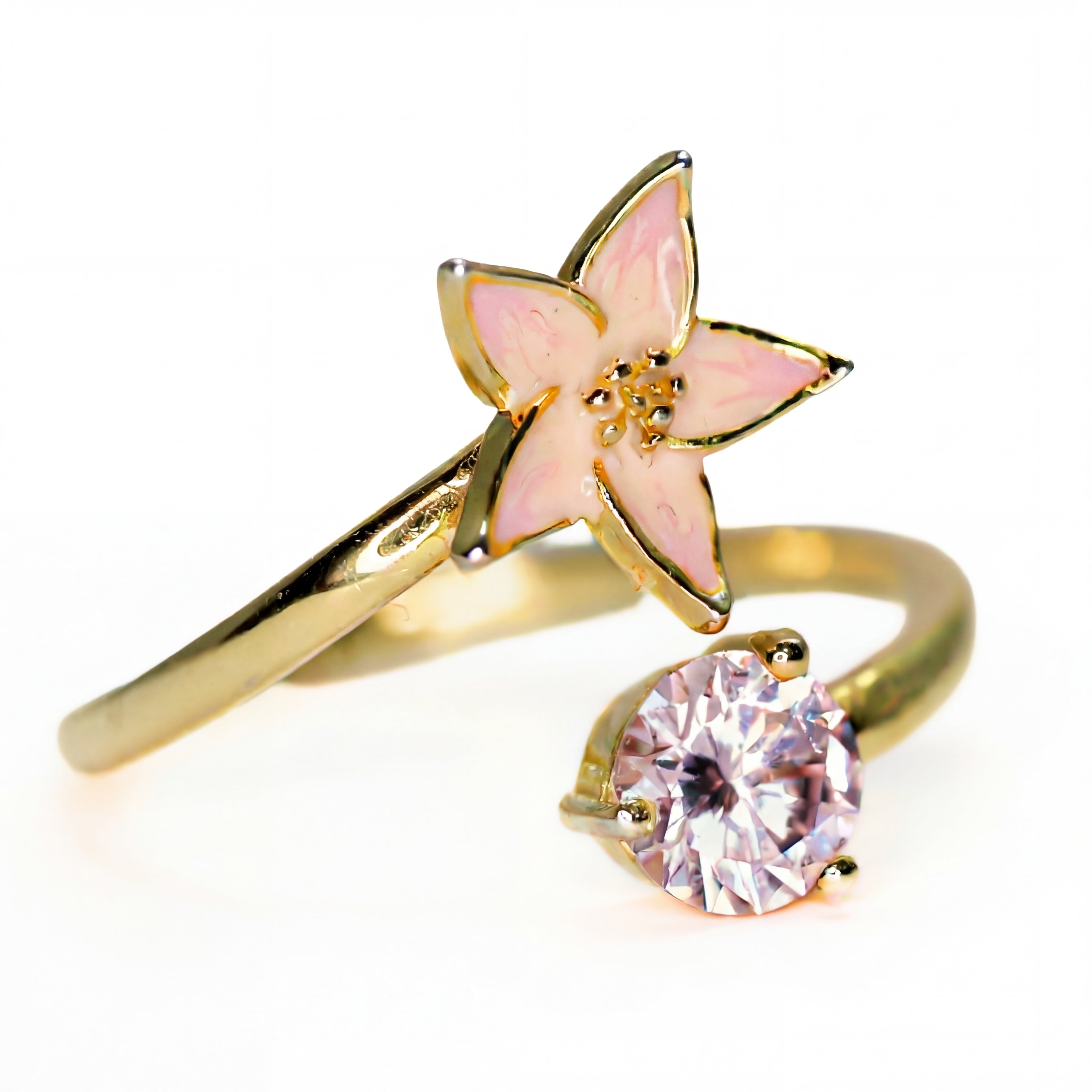 Handmade Gold Plated Adjustable Silver Ring with Pink Enamel Flower & Pink Stone | Hypoallergenic Designer Jewelry