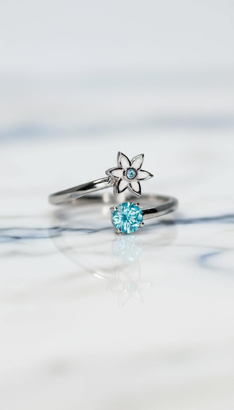 Handmade Silver Ring with Blue Stone & White Enamel Flower | Hypoallergenic Designer Jewelry