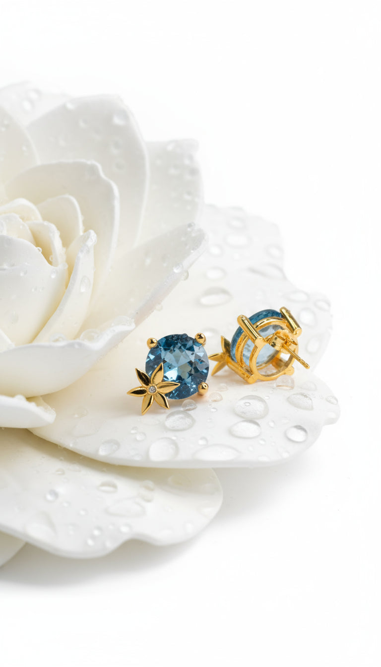 Handmade Gold Plated Silver Stud Earrings with Blue Crystal & Golden Flower | Hypoallergenic Designer Jewelry