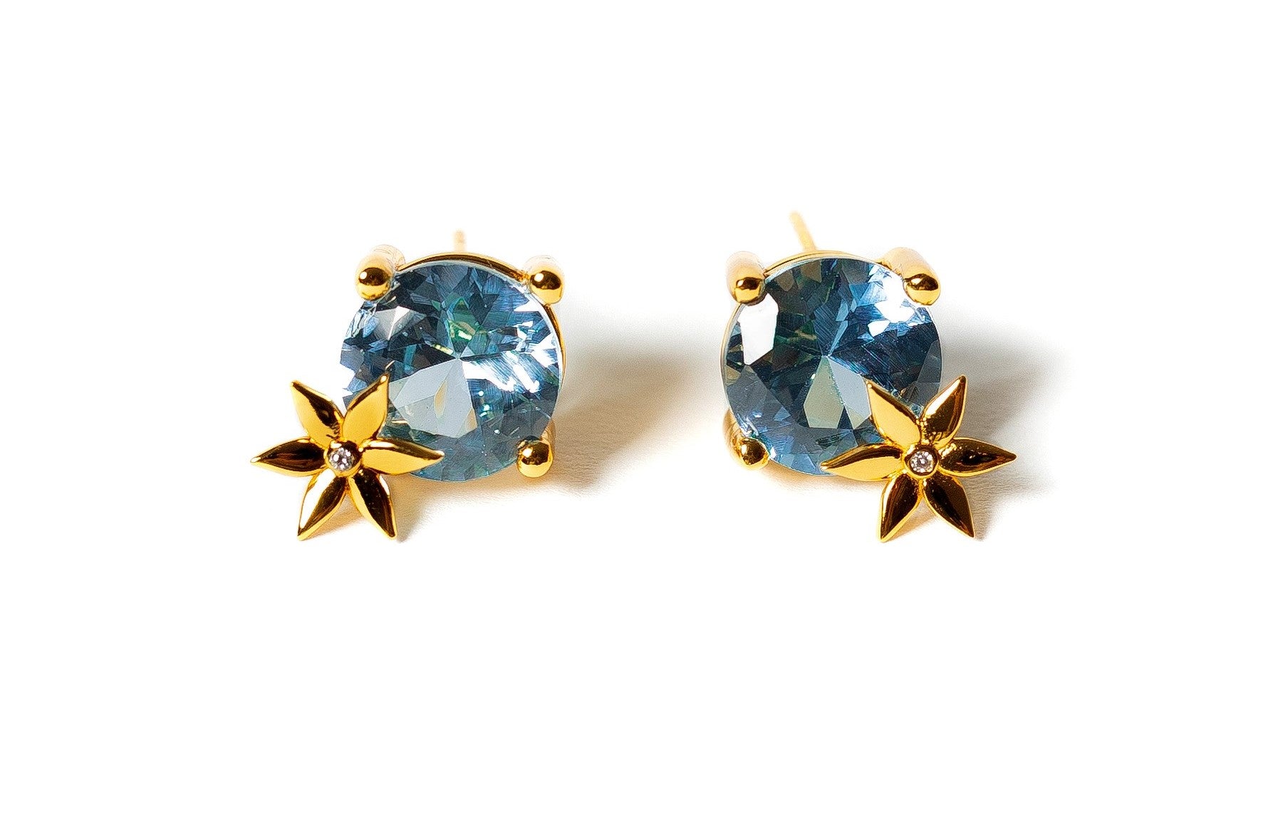 Handmade Gold Plated Silver Stud Earrings with Blue Crystal & Golden Flower | Hypoallergenic Designer Jewelry